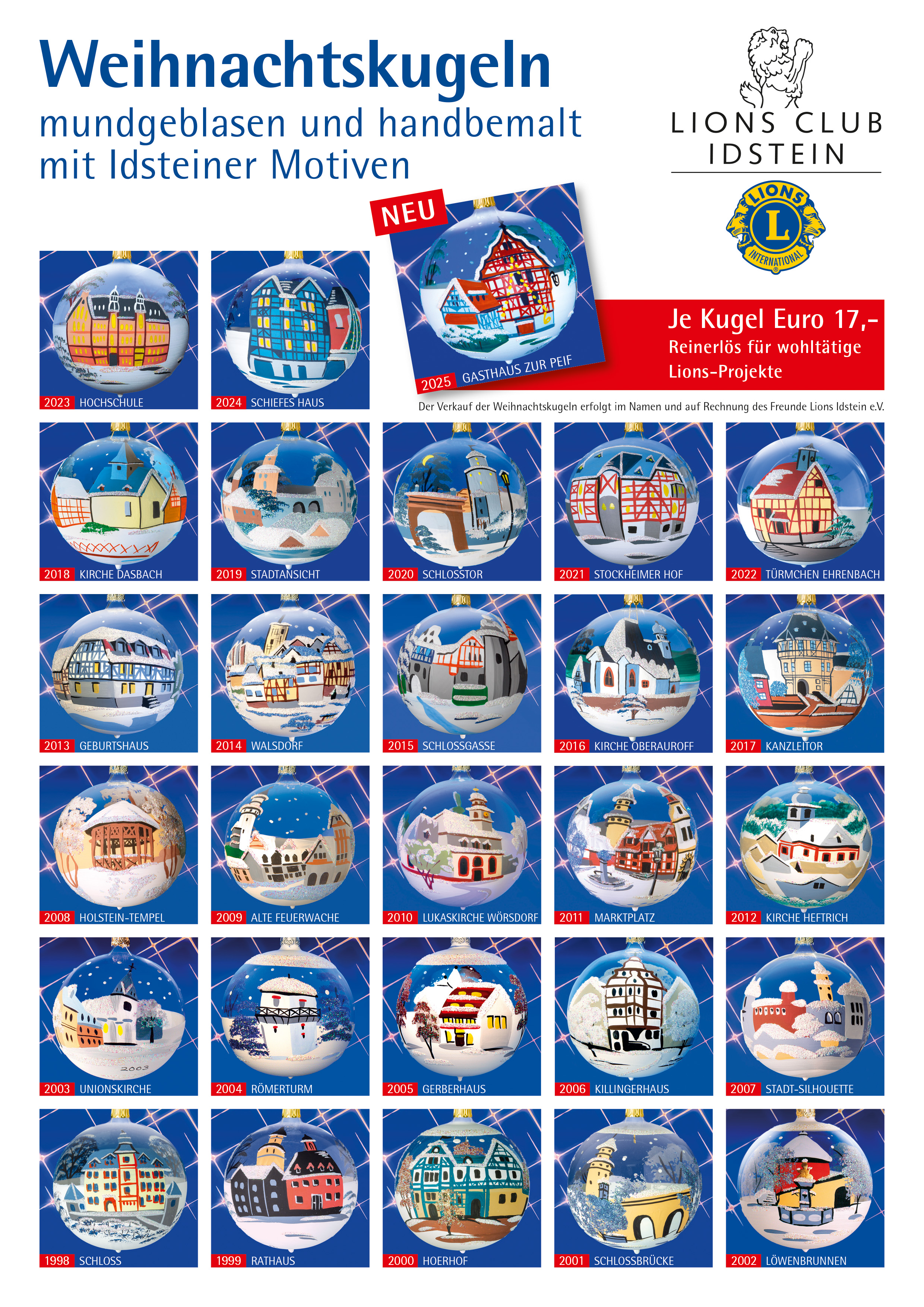 Ergänzend zu Augenoptik Kloppenburg können Sie die aktuellen und auch älteren Kugeln in den folgenden Geschäften kaufen: Touristeninformation im Killingerhaus, Apotheke im Medimed, Flora-Apotheke Wörsdorf, Schuhhaus Flinner, Café Ungrad, Weltladen Idstein, Felsenkeller sowie der Weihnachtsbaumverkauf an der Hohen Straße. Das Windlicht hingegen ist ausschließlich auf dem Weihnachtsmarkt erhältlich.